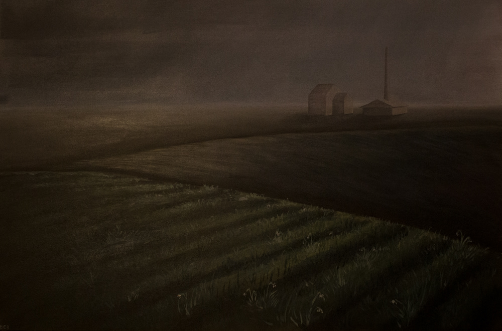 Landscape of the well used land surrounding the brick works. The fields were quarried for clay, then the hole used as a swimming reserve, then filled with industrial waste and now is a methane leaking patch of unstable ground. Acrylic on canvas